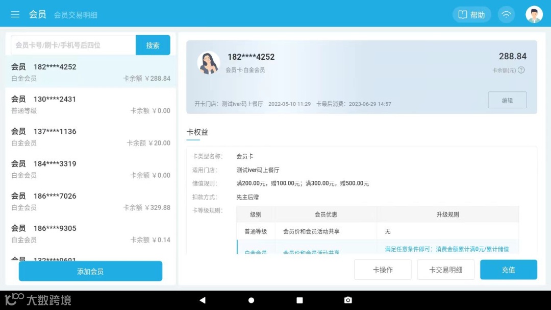 在最新版本中,您不仅可以通过手机后四位数字搜索会员,也可以直接在收银机展示的会员列表中找到所有会员,方便您快速找到对应会员,进行充值等操作。
