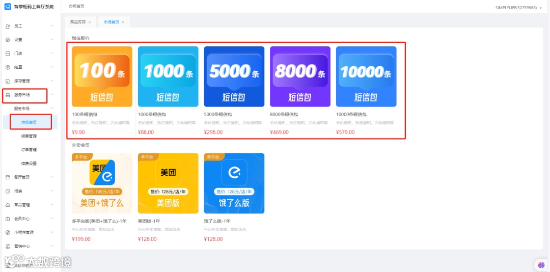 2. 进入码上餐厅系统后台→服务市场→市场首页,按需购买对应的短信包