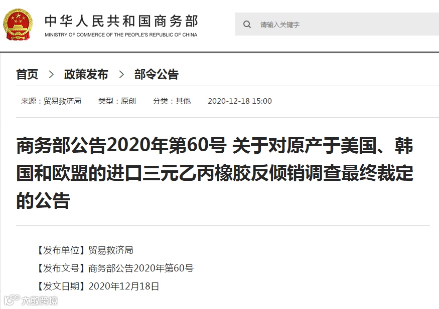 据商务部网站消息,根据《反倾销条例》第三十八条规定,商务部向国务院关税税则委员会提出征收反倾销税的建议,国务院关税税则委员会根据商务部的建议作出决定,自2020年12月20日起,对原产于美国、韩国和欧盟的进口三元乙丙橡胶征收反倾销税。实施期限5年。