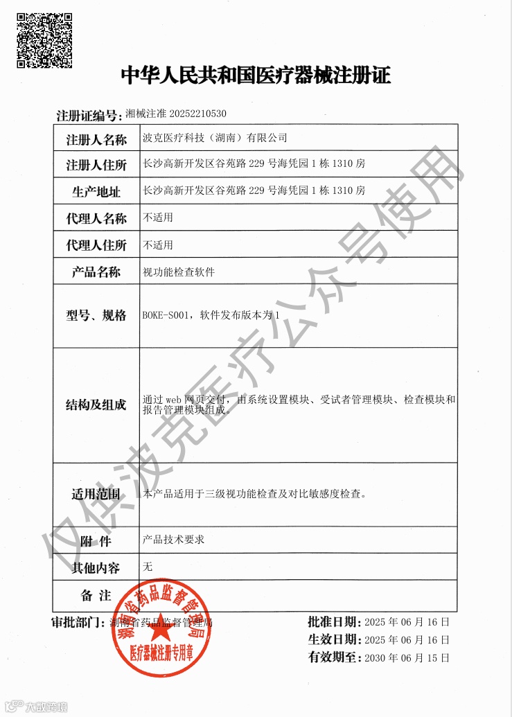 2025年6月16日波克医疗视功能检查系统获批国家二类医疗器械注册证。该系统搭载设置模块、受试者管理模块、视功能检查模块和报告管理模块,可通过WEB网页对用户开展三级视功能以及对比敏感度检查。更多产品内容请关注 ”波克医疗“ 公众号!