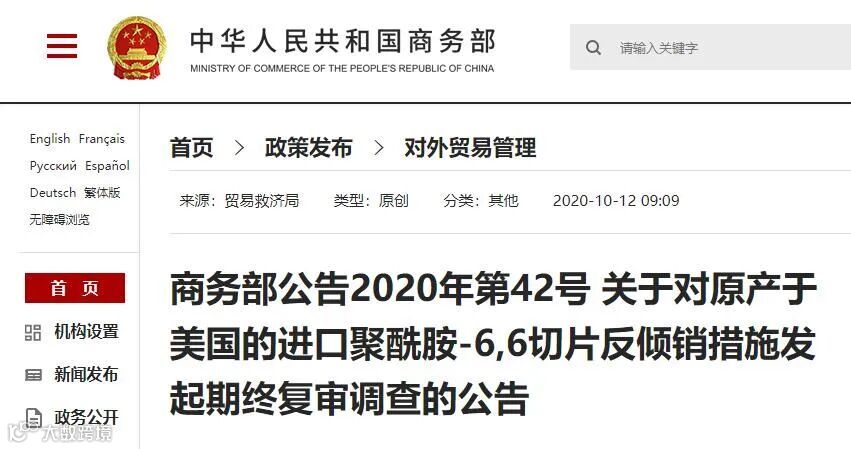 根据《中华人民共和国反倾销条例》第四十八条规定,商务部决定自2020年10月13日起,对原产于美国的进口聚酰胺-6,6切片所适用的反倾销措施进行期终复审调查。
