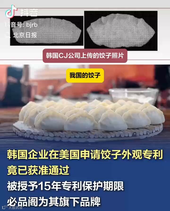 近期,韩国食品企业CJ第一制糖股份有限公司(以下简称“CJ公司”)在美国成功注册饺子外观设计专利,保护期15年。