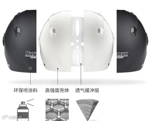头盔一般包括外壳、缓冲层、内衬层、护颚、系带、镜片等。其中,外壳是头盔的最外层,在撞击时承受和分散冲击,所以外壳材料的选用非常重要;缓冲层在遇到大力冲击时起到缓冲效果,通常选用能吸收碰撞能量、无毒、无害、吸汗、透气的材料制成,大部分缓冲层采用发泡苯乙烯(EPS)材料。