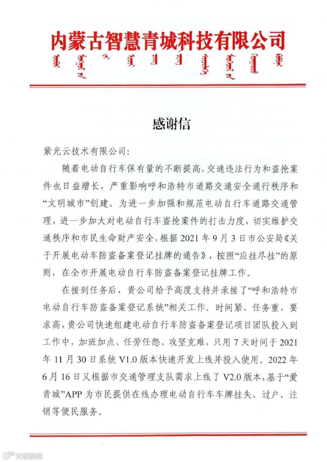 呼和浩特市联合紫光云上线电动车牌码系统,将车牌登记申请、车辆过户等办事流程线上化, 落实了“码牌合一”数字化管理,实现了上牌率和群众满意度“双提升”,强化了全市的电动车综合治理效能,为其他城市提供了实践参考。