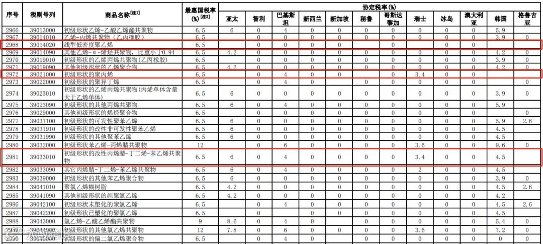 调整进口关税税率:此次调整的关税包括最惠国税率、关税配额税率、关税配额税率,自2020年1月1日起对859项商品(不含关税配额商品)实施进口暂定税率,其中涉及200多种塑化行业产品,ABS、PP、苯乙烯、己二腈等都在降税之列: