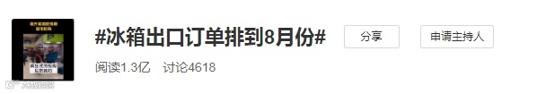 日前,一则“美国人排队3个月买冰箱,中国冰箱海外订单排到8月份”的消息登上微博热搜,话题阅读量超过1.3亿,参与讨论人数达到4千多人。