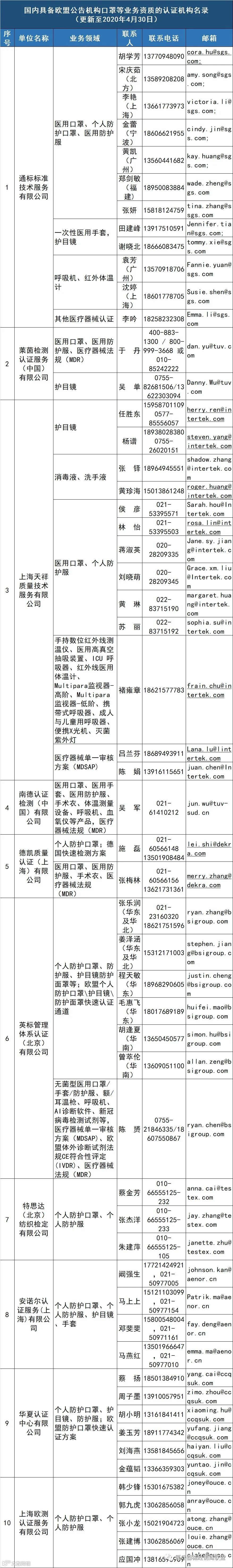 国内具备欧盟公告机构口罩等业务资质的认证机构名录