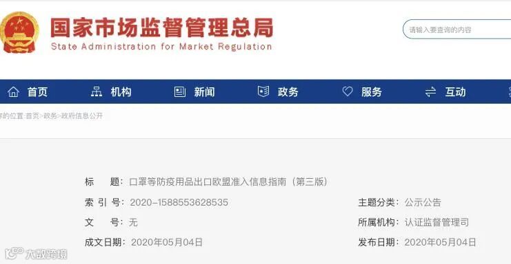 就在5月4日,国家市场监管总局最新发布了《口罩等防疫用品出口欧盟准入信息指南(第三版)》,对防疫物资出口欧盟作出了详细的解读,其中对国内具备欧盟公告机构口罩等业务资质的认证机构名录和国内可开展医疗器械管理体系认证的机构名录也进行了更新。