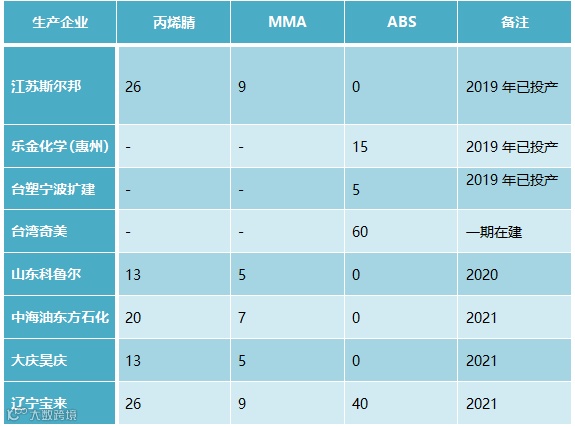 国内2019年投产及拟/在建丙烯腈—MMA—ABS项目(单位:万吨)