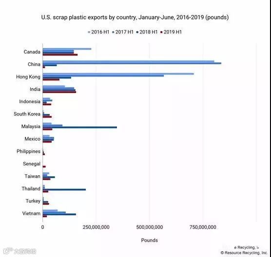 2019年上半年,美国废塑料的目的地排名为:加拿大(1.63亿磅,折合7.4万吨),印度(1.56亿磅,折合7万吨),香港(7800万磅,折合35380吨),马来西亚(4500万磅,折合2万吨),墨西哥(4200万磅,折合1.9万吨),韩国(4200万磅,折合1.9万吨),印尼(4000万磅,折合1.8万吨),台湾(3600万磅,折合1.6万吨),土耳其(3000万磅,折合1.3万吨)和泰国(2600万磅,折合1.18万吨)。