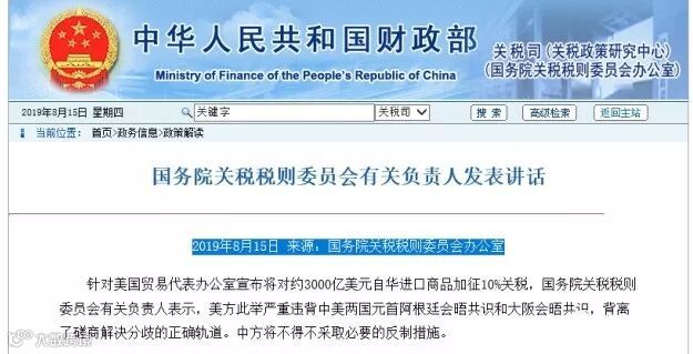 昨日,一则国务院关税税则委员会的消息,引发了市场的波动。针对美国贸易代表办公室宣布将对约3000亿美元自华进口商品加征10%关税,国务院关税税则委员会有关负责人表示,美方此举严重违背中美两国元首阿根廷会晤共识和大阪会晤共识,背离了磋商解决分歧的正确轨道。中方将不得不采取必要的反制措施。