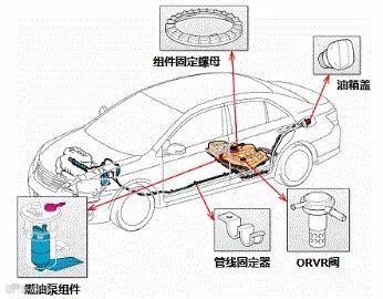 油箱装有ORVR(Onboard Refueling Vapor Recovery)阀、截止阀等阀门类零件。ORVR阀防止加油时燃料蒸发气体从加油口排放到大气中。截止阀防止车辆侧翻时燃料从油箱流到外面。