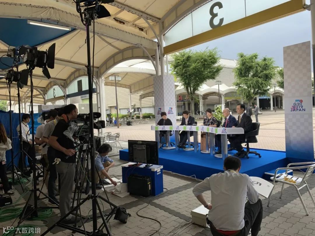 △6月29日上午,大阪国际会展中心入口处的现场演播室。日本一档政治谈话节目《Wake Up! Plus》正在直播,嘉宾们讨论的高频词是“中美”。(央视记者沈忱拍摄)
