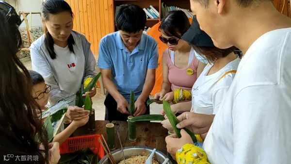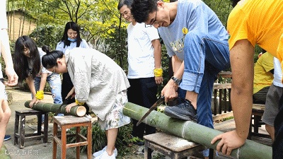 农家乐老板还教导大家学习制作竹筒饭,众人悉心学习,遇到不会的问题,也会敢于寻求帮忙,让自己的“作品”变得更好。