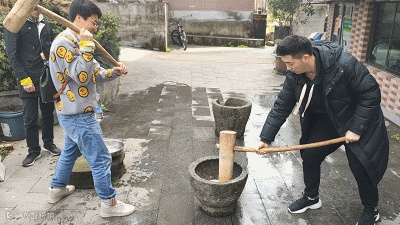 黑火石的小伙伴们在麻糍店老板娘的示范下,纷纷拿起木碓,前来尝试打麻糍的过程,在双人合作阶段,更是将配合与默契,很好的诠释出来。