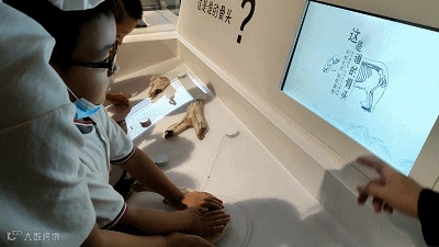 很多小朋友活跃在展馆中,兴致勃勃地体验展馆内新奇有趣的互动装置。物体识别触摸屏可以让小朋友们充分了解各类化石的信息,孩子们可以把桌面上的骨骼模型放置在感应区,系统识别后触摸屏上就会告诉小朋友对应动物的骨骼。这种新颖的玩法,让博物馆在孩子们心中不再是枯燥乏味的地方。