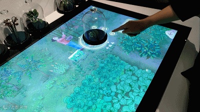 在吴风的展厅中还有物体识别桌面、滑轨屏以及沉浸式投影。游客使用桌面上的植物标本,将它放置到触摸屏上,桌面会概括出该标本情况。滑轨屏以及后面的沙盘,向游客介绍吴中的风俗文化。有趣的是,每当滑轨屏滑动一次,不管是屏幕内容还是背后沙盘,都可以显示一个季节的风俗文化。环形的沉浸式投影,循环播放影片,游客可以全面的了解到当地的四季变换和人文风情。