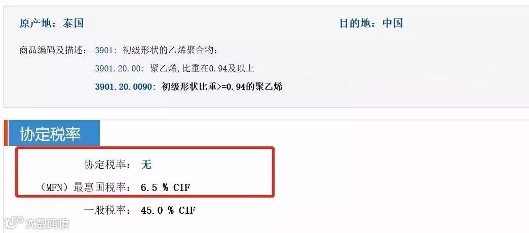部分产品除外,比如:HDPE、LDPE(上图所示HDPE 39012000.90,提供Form E也没有0关税优惠,进口关税率为6.5%)等。