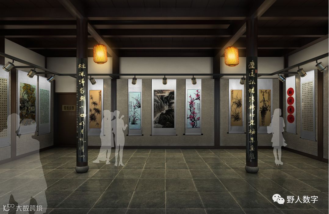 黄灰色油画布包裹基础墙面,暖色专业展览灯光,可以展示书画,也可以作为日常展览。展品选择自由、陈列内容和艺术形式灵活,容易更换。