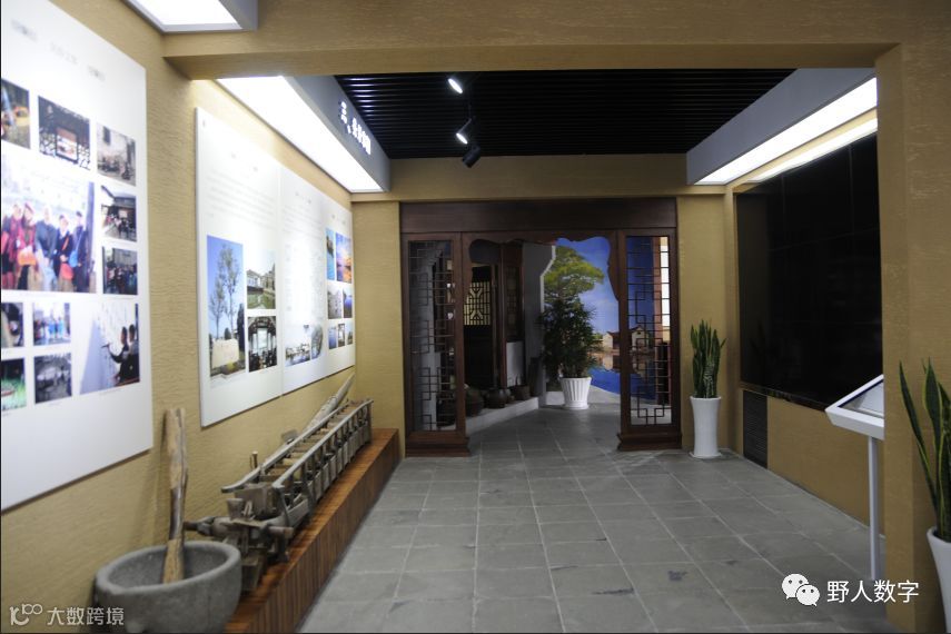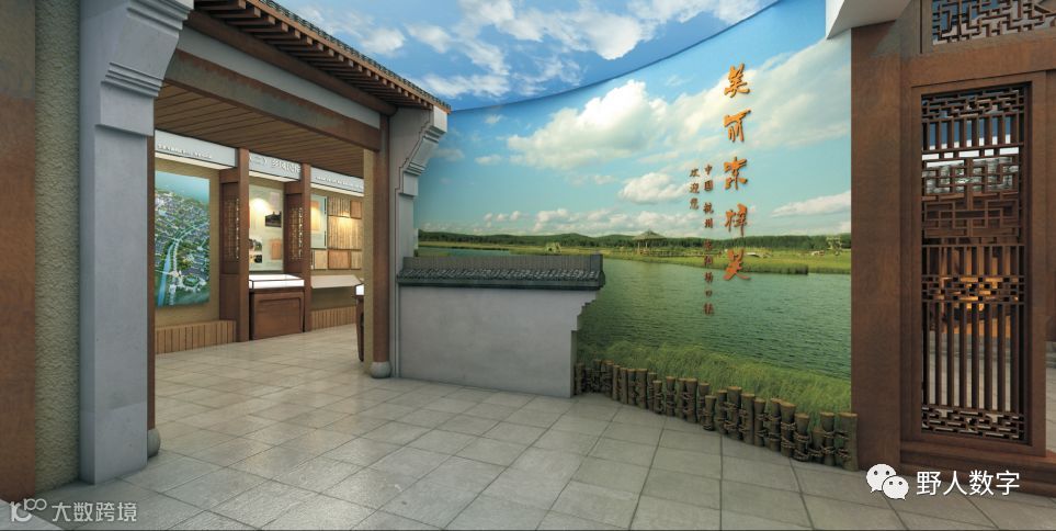 序厅通过乡村建筑特色造型,背景墙“农村风光”墙绘有机结合,体现主题思想“富春山居,美丽东梓关”。