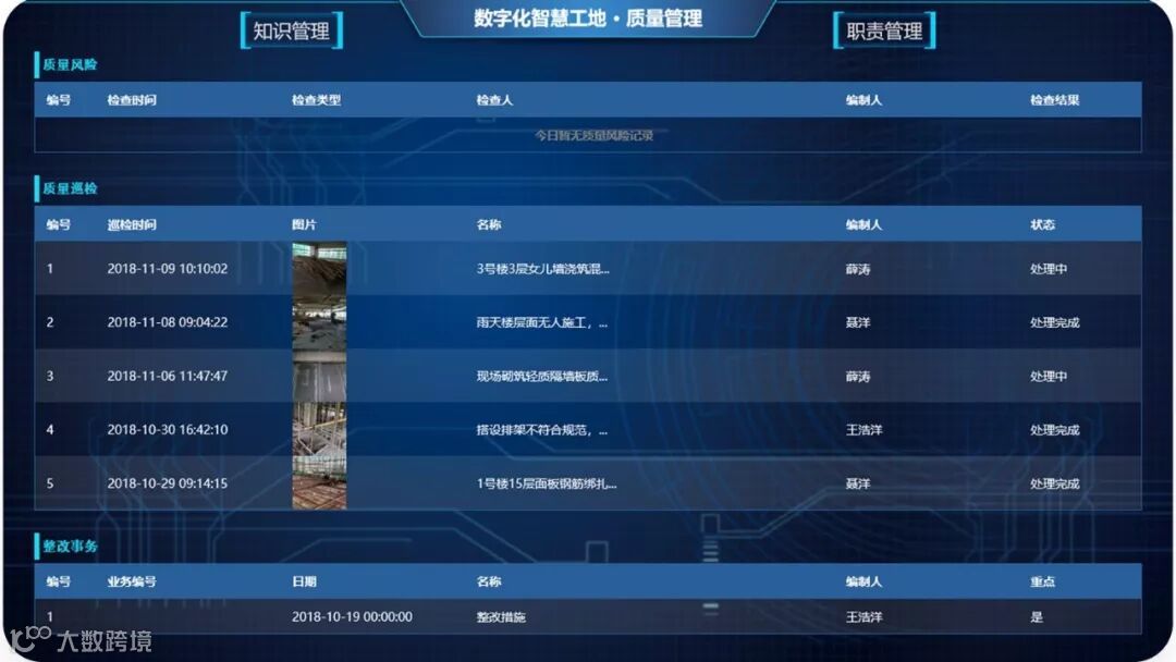 数字化智慧工地云平台利用可视化图表实时显示项目现场动态信息,驾驶舱内的信息与基础管理平台内数据同步,并且支撑跟踪反查平台内信息。