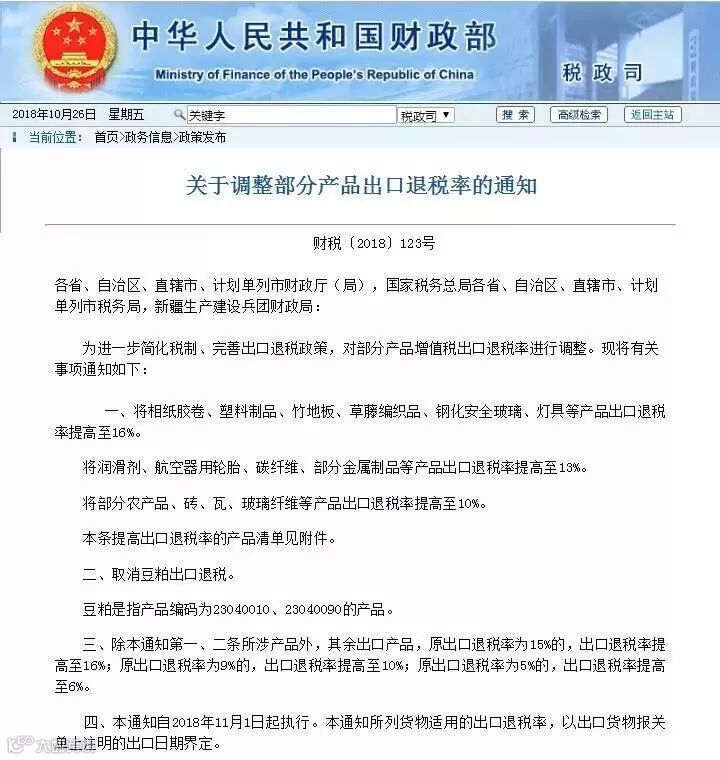 10月25日,财政部、税务总局发布《关于调整部分产品出口退税率的通知》(以下简称《通知》),对部分产品增值税出口退税率进行调整。这是继今年9月份以来,财政部第二次以文件形式对出口退税率进行大规模的调整。在今年9月初,上述部门就联合发布了《关于提高机电、文化等产品出口退税率的通知》,自9月15日起,对机电、文化等产品提高增值税出口退税率。