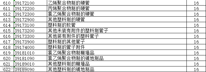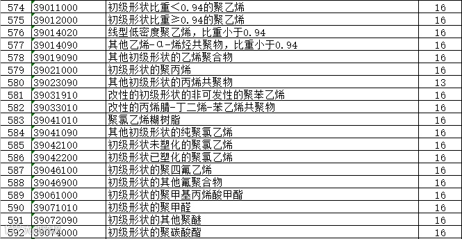 产品名单中部分出口塑料原料及塑料制品 (注:右方空格数字16为退税率,单位:%)