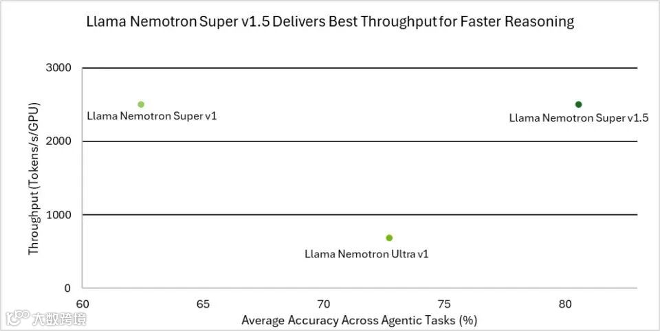 图 3. Llama Nemotron Super v1.5 为代理任务提供更高的准确性和吞吐量,降低了推理成本
