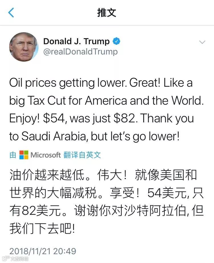前几日,特朗普在推特上表示:“油价还在持续走低,太棒了!这相当于是给美国和全世界大减税。享受吧!才(每桶)54美元,而前不久还是82美元一桶。谢谢沙特阿拉伯,让我们一起努力,让油价再低点!”