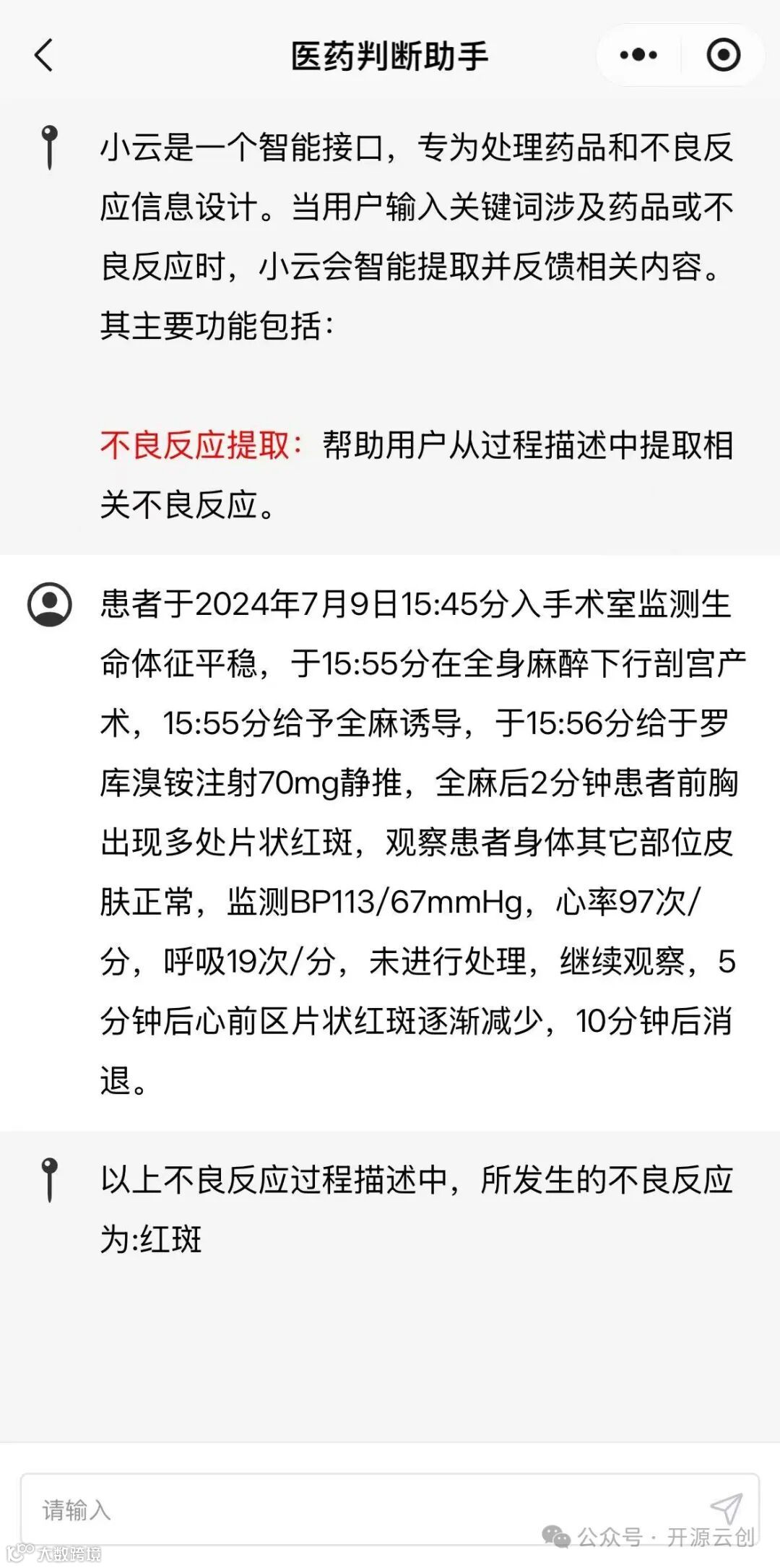 用户可以输入关键词涉及药品或不良反应,小云会智能提取并反馈相关内容。主要是不良反应的提取,帮助用户从过程描述中提取相关不良反应。