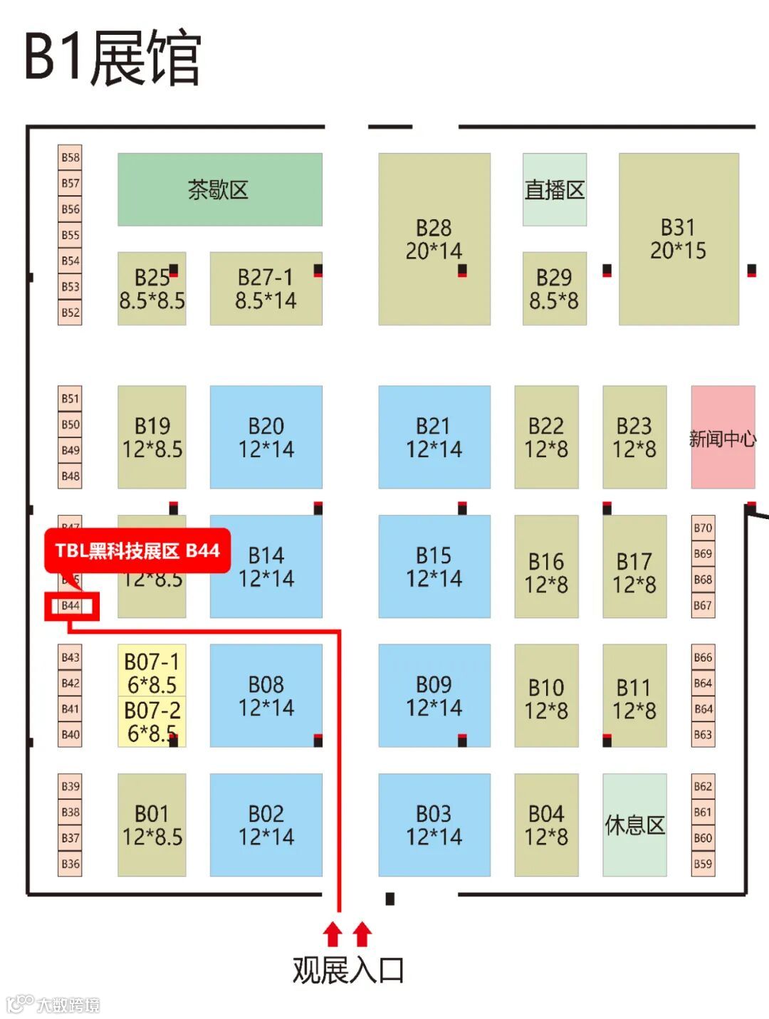B 馆外查验苏康码、行程码——安检——B1 馆入口签到(凭电子门票)——领取大会贴标——入馆——到达B44(TBL黑科技展位)