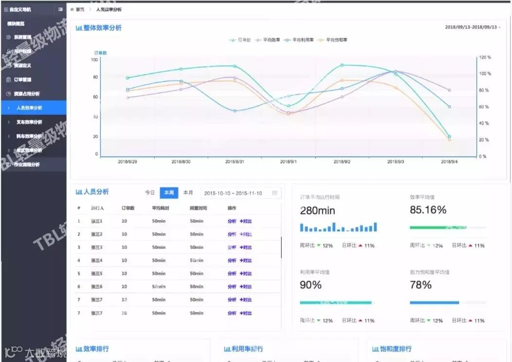 仓库中的资源主要就是人、车、库,公司的大数据分析可实现资源占用分析,涵盖人员分析、车辆分析、存储区分析。