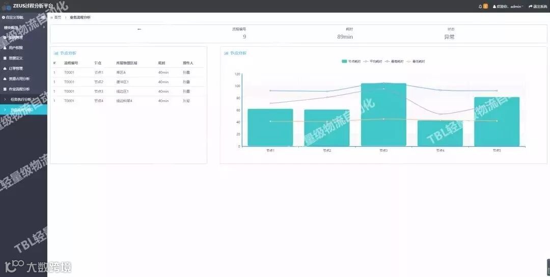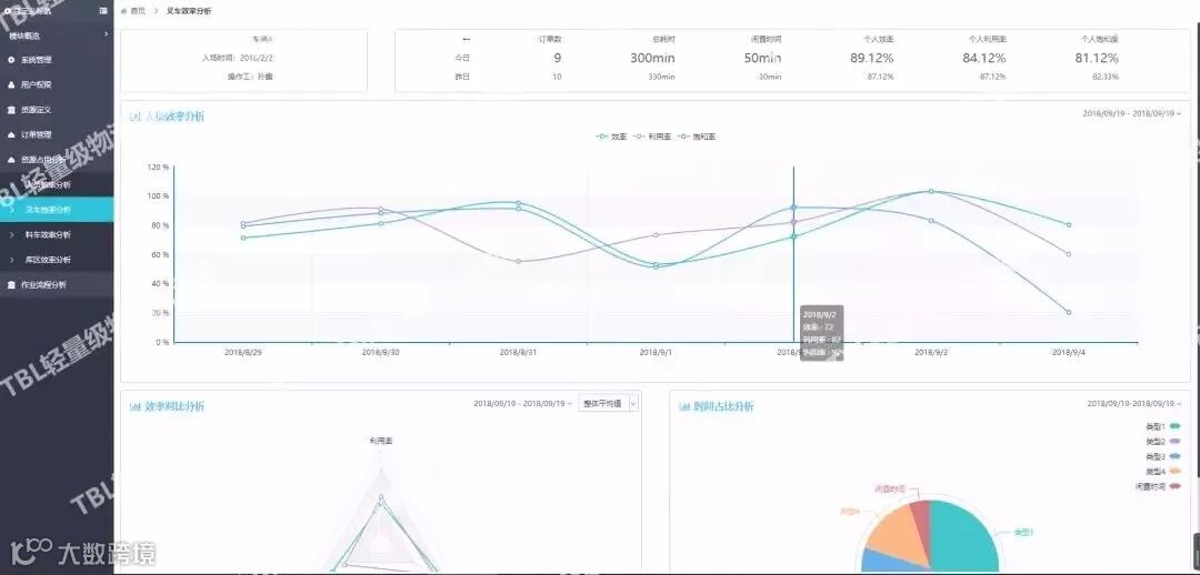 图片是我们大数据分析的呈现页面,仓储资源(人、车、库)的利用率一目了然,同时能够根据业务效率看出存储花的时间长的原因,有针对性的进行优化。