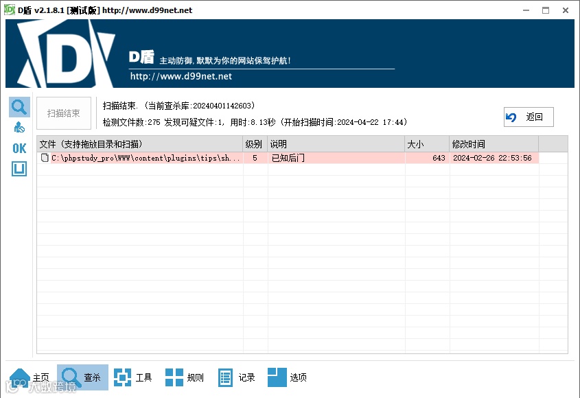 ● D盾扫描网站根目录发现webshell(webshell文件名为shell.php)