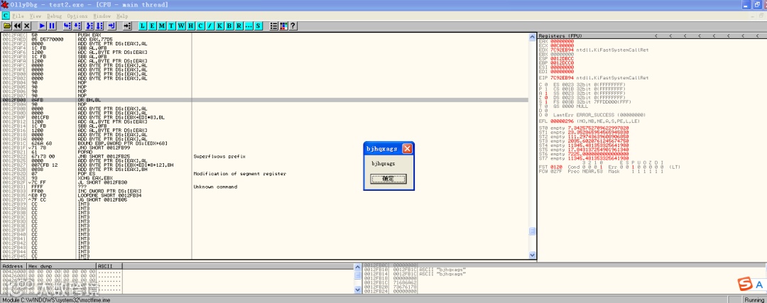 当执行RETN指令后,CPU会到0012FAF0去执行代码,从而改变了程序的运行流程,转而去执行我们填充的payload。Payload执行完如下图:
