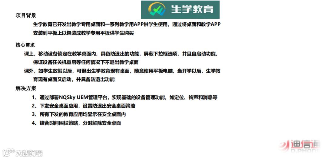 具有移动化办公需求的所有的企业、政府、各种事业单位以及军队武警、司法监狱、电力能源、公安警务、快消零售、烟草、国企央企、金融保险、交通物流、教育卫生等等各行业。UEM是数字化端点、应用、数据的控制中心,实现移动统一身份认证、移动及物联网设备管理、场景化设备管理、新型桌面设备管理、移动双域管理、移动安全接入、移动办公门户、移动数据安全管理、应用商店、移动等保合规。现产品版本划分为标准版、军队版、公安版、教育版四大大方面。