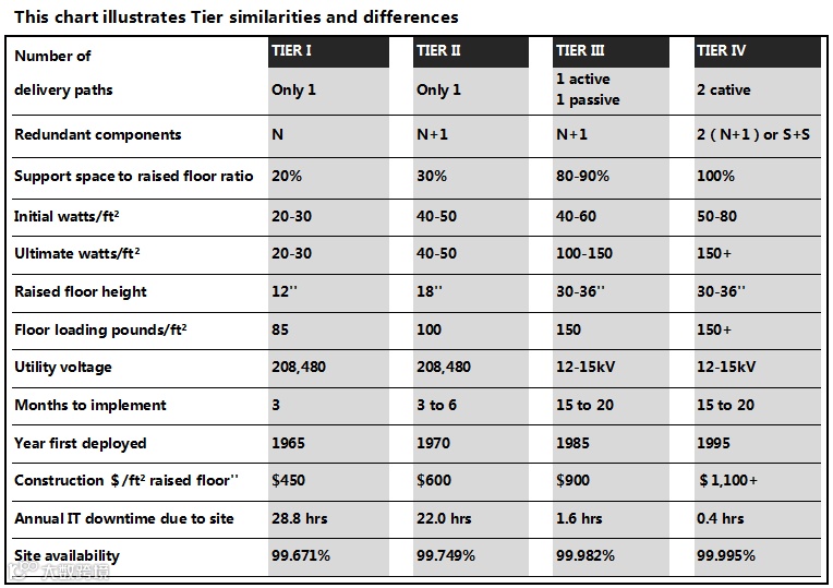 从上述对比来看T3和T4还是比较接近的,都是针对系统不间断和长期可用有严格要求的业务,在一个T3的系统中,任何一个容量组件都可以有计划的从系统中移除,而不会影响关键环境货IT进程,T4则更加强悍,任何容量组件和分配路径可以容忍一次失效、错误或计划外事件,而不影响关键业务环境或IT进程。