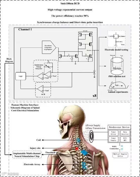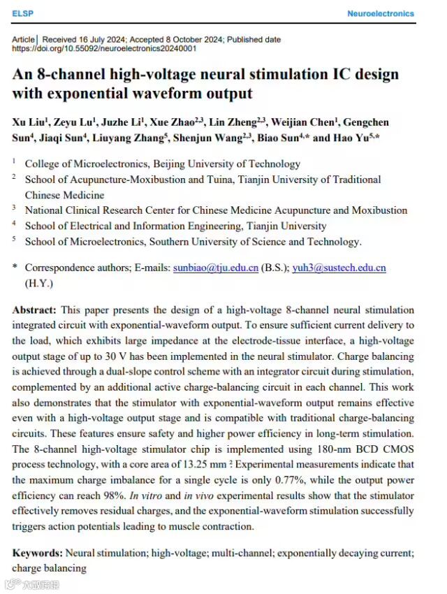 10 月 26 日消息,来自天津大学、北京工业大学、天津中医药大学、南方科技大学的研究人员合作设计出一款八通道高压神经刺激集成电路,采用双相指数波形输出和电荷平衡,极大提升了神经刺激的效率和安全性。