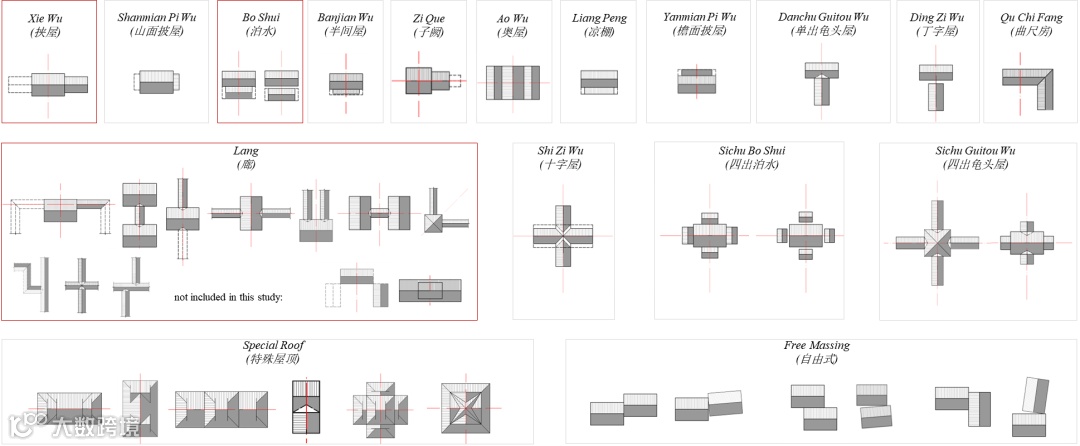 我们的视角与方法首先从单体建筑出发,再扩展至建筑群体组合。在前人研究中,大多侧重于单体建筑的形制分析,而单体之间的组合规则往往被忽视。基于前人提出的“建筑组合体”及“屋顶组合”理论,我们总结出“建筑形体组合类型”这一概念,并以此尺度来研究两宋时期的建筑。