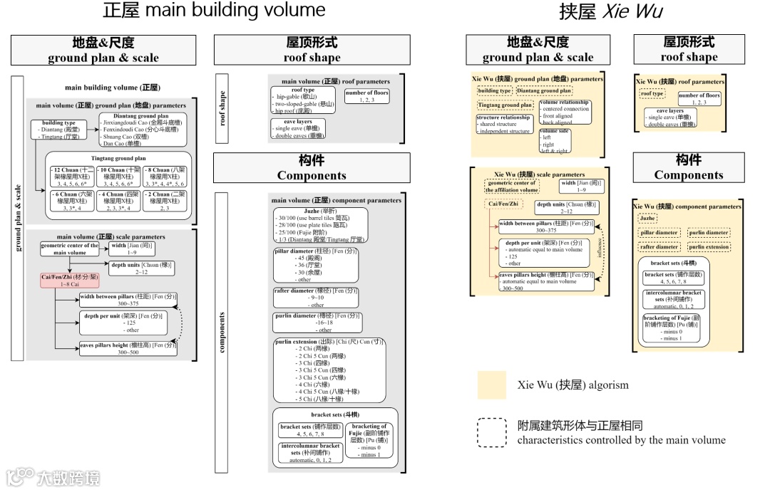 数据整合完成后,我们进入下一阶段:将建筑形体组合规则转化为算法信息。这一过程主要分为输入、运算与输出三个步骤。输入部分,依据传统建筑史知识,将参数分为地盘尺度、屋顶形式及构件三部分。通过这些基本尺度的输入,我们得到控制点与控制线,最终生成体量。在此过程中,虽然这些参数不足以代表古代建筑设计的所有因素,但它们对于建筑形体组合至关重要,因此我们将其提取并强化,通过建模实现算法。