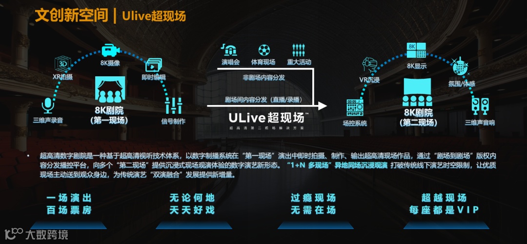 在文创的新空间领域,我们目前正在着力打造ULIVE超现场的技术和空间,也是我们京东方打造的全球首个8K级的超高清第二现场的技术和解决方案,以数字化的制播系统在第一现场演出中即时拍摄、制作、输出超高清的现场作品,通过剧场到剧场的分发、播控的链路向多个第二现场提供沉浸式的现场内容的观演,打破观众线下观演的时空限制、观演比限制和座位的限制。