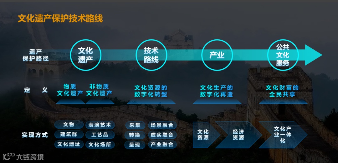 文化遗产的保护首先要分析遗产资源在采集、转换、展现的过程中如何使用先进的数字技术,从而能实现场景的融合、虚实的融合和产业的融合,实现文化生产的数字化再造,最终实现文化资源向经济资源的转化,为全民的公共文化的服务事业做出贡献。