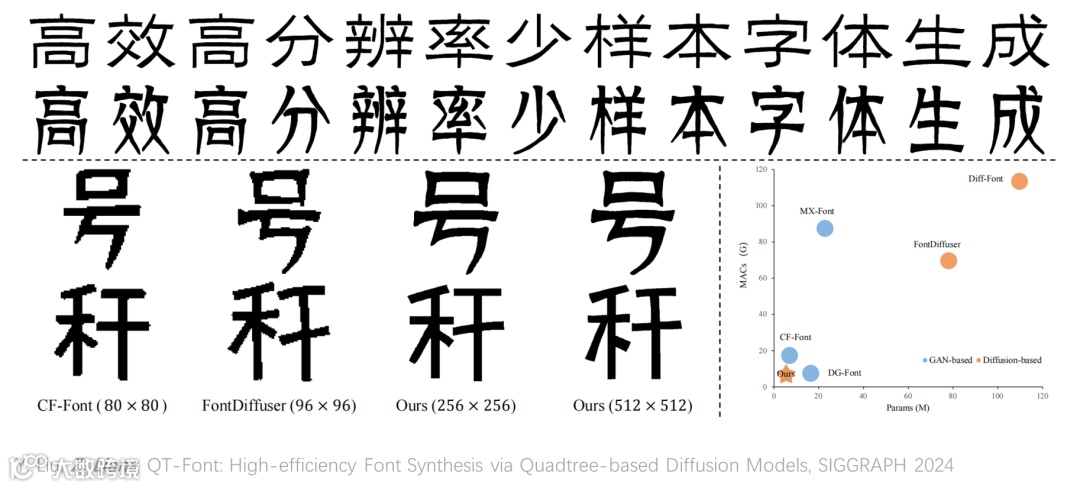 我们生成1024×1024的字形图像,并进行矢量化处理,用极少的控制点即可精确表示轮廓。它能完成哪些任务?例如字体生成:输入黑色部分的几个字,红色部分为自动生成——系统学习其风格后,自动生成该书法家未写过的字,无论在质量还是风格一致性上都表现优异。此外,还可实现高分辨率缩放。同样的模型也能用于艺术特效字生成:输入设计师创作的艺术效果字形,系统可学习其风格并进行生成。我们采用了误差扩散模型,通常采样需要几十甚至上百步,而我们实现了一步采样的方法,将生成速度提升了数十倍乃至上百倍。