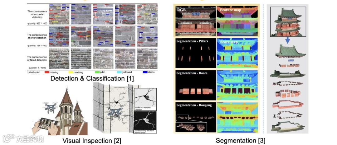 人工智能技术已经被应用到了各行各业,在文化遗产方面也有非常多的应用,包括文化遗产的监测和分类工作,操控无人机或者机器人对建筑进行非接触式的观测,以及一些建筑模型的部件分割工作(图 1)。图2是机器学习或者人工智能技术应用到文化遗产领域的经典案例,这个案例是以滕王阁为对象的应用研究,相较于之前在普通和简单的场景下的三维分割研究,其目的是分割斗拱等复杂建筑构件,带来了非常多的新应用前景的启发。