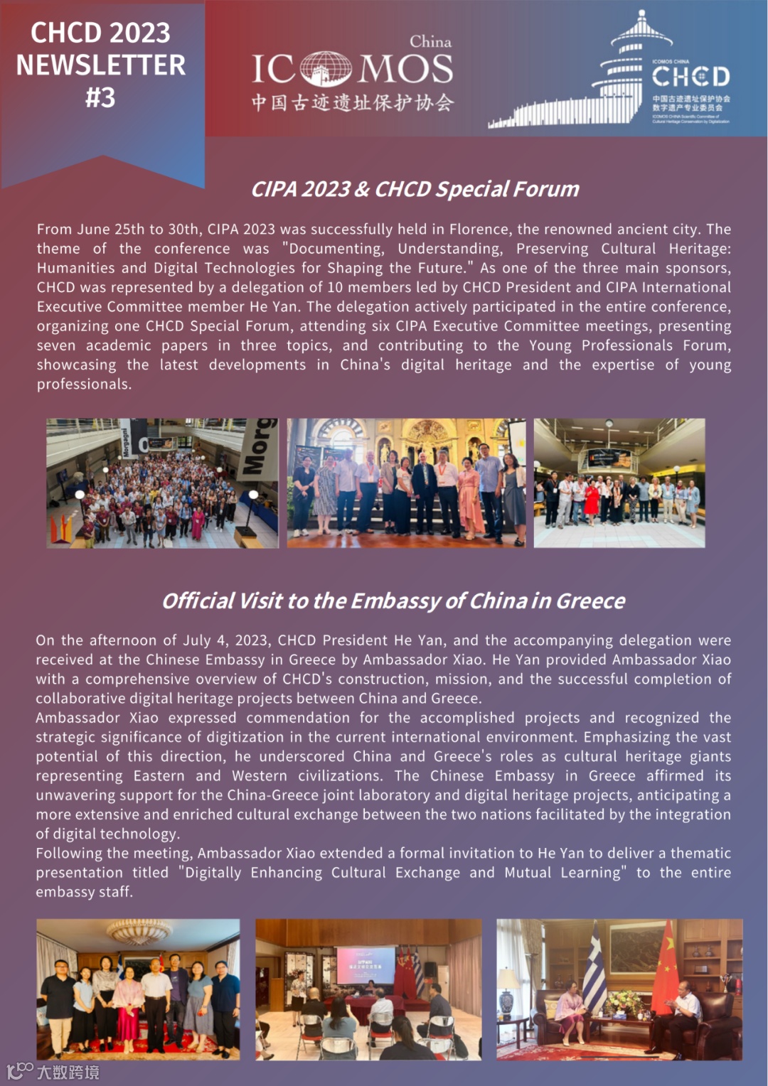 新闻部分报道了2023年6月25-30日,专委会于意大利佛罗伦萨参加CIPA2023全球双年会并举办CHCD边会;7月3日下午于希腊国立雅典理工大学召开“中希数字遗产圆桌会谈”;7月4日上午到访希腊国家考古博物馆(NAM);7月4日下午于中国驻希腊大使馆做《数字阐释增进文明交流互鉴》专题报告;8月25日举办专委会2023年会;9月4-8日专委会代表CIPA参加ICOMOS-GA。