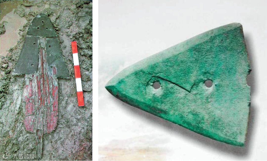 此外,良渚文化最重要的玉器就是玉钺(图4),是作为王权的权杖使用的。玉钺杖的整体形式是中国甲骨文“钺”字的象形字,也是中国 “王”字的起源。钺的上面,装饰着类似小船形状 的玉器,是神像的帽子的一半,就是神像的帽子 对折起来的样子。这个就是代表王权神授、君权 神授的设计理念。这个设计一直存在我们中国的《史记》里面,周武王伐商的时候,就一直被用来作为指挥权杖。