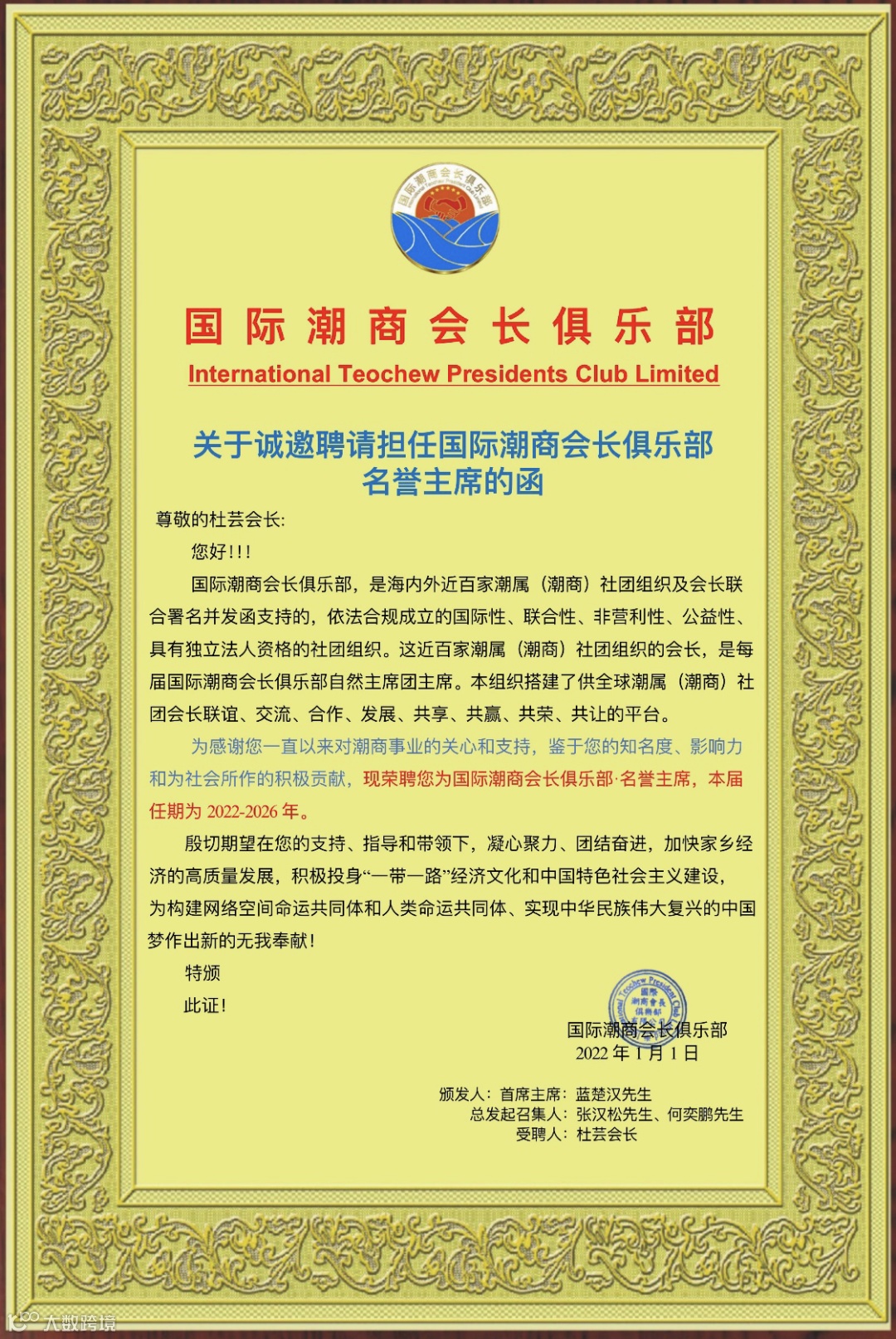 在2024年2月14日举行的第八届国际潮商会长新春座谈会上,中国国际经济技术合作促进会绿色城市建设工作委员会会长杜芸受聘担任国际潮商会长俱乐部名誉主席。