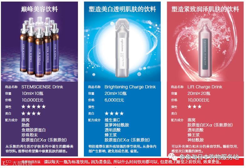 乐敦episteme别看是小小的一支,这里面可是凝结了乐敦最高级的黑科技,这款口服液利用了乐敦独家研发的再生医疗技术,独创的Inner Stem Complex成分,能修护细胞,阻断体内的糖化发生,防止胶原蛋白的流失。做到了通过食品成分促进脂肪干细胞的增殖,成功实现通过喝入体内的饮品来激活干细胞的技术。