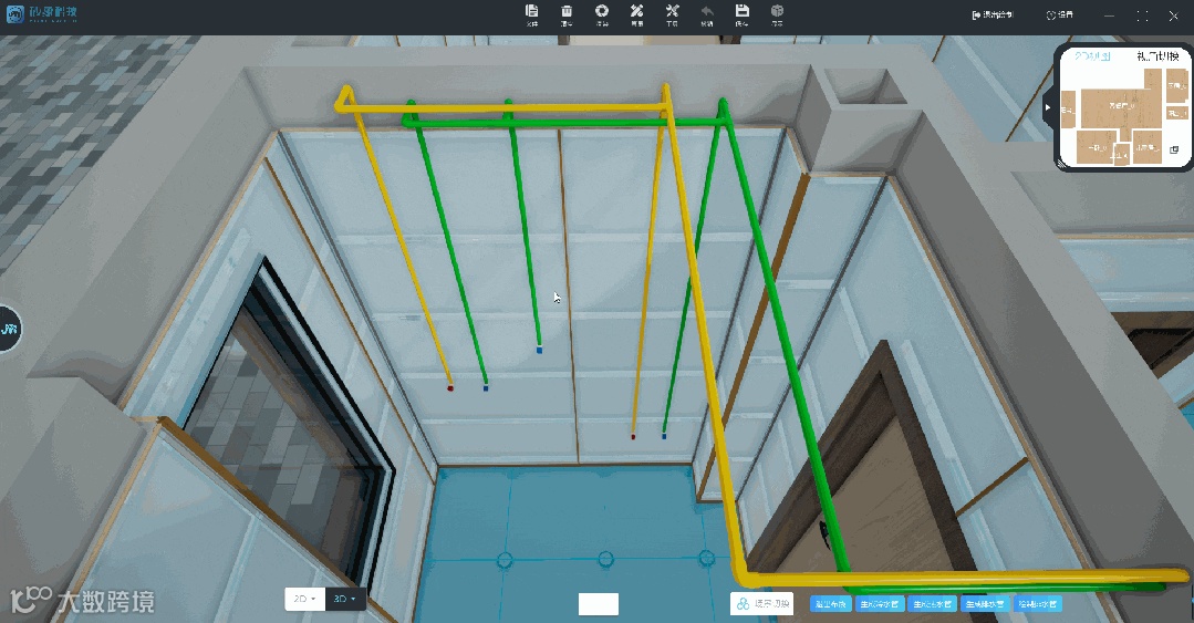 4、用水房间内管路生成:进入的冷热水管沿顶面下墙至用水点走管,与最近的立面墙间距≥100mm。