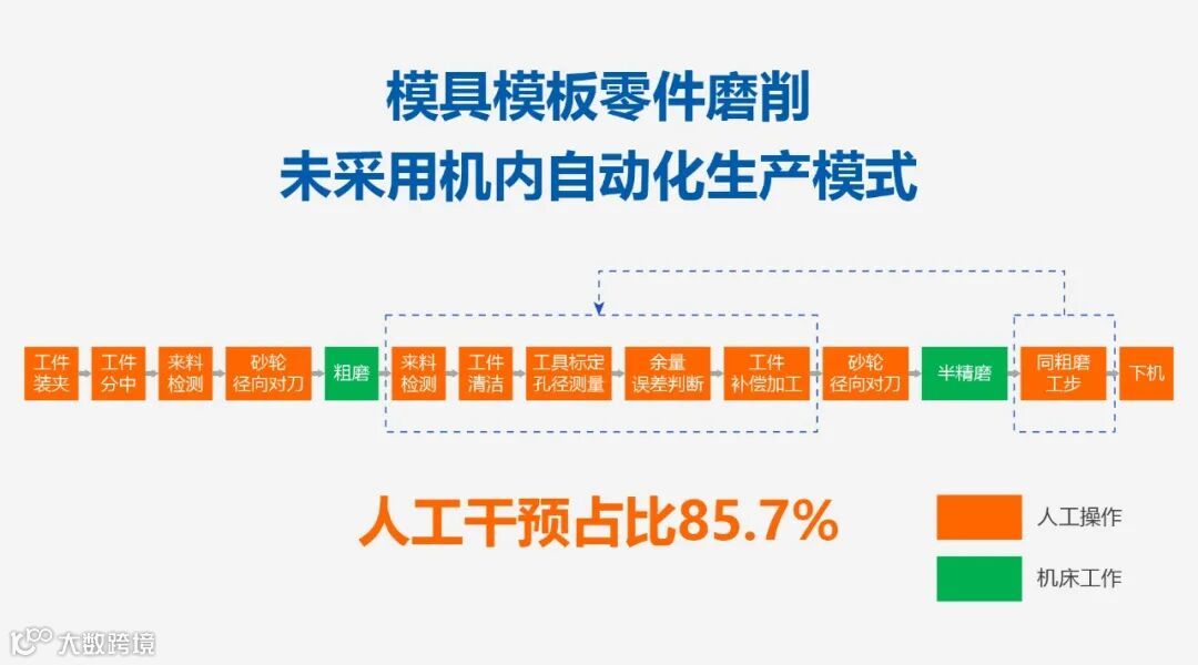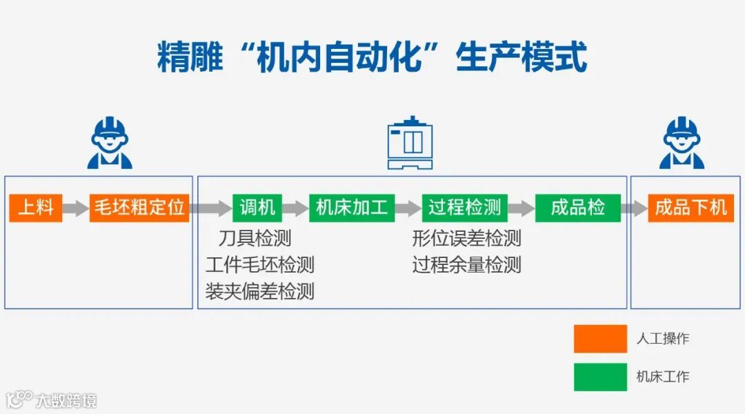 为了提高机床连续运行时间,行业内开始在机床上加装传感器,通过程序驱动传感器获取生产要素数据,确认生产要素状态,部分由人机协同完成的工作逐步转变为机床自动执行,形成了“机内自动化”的生产模式。